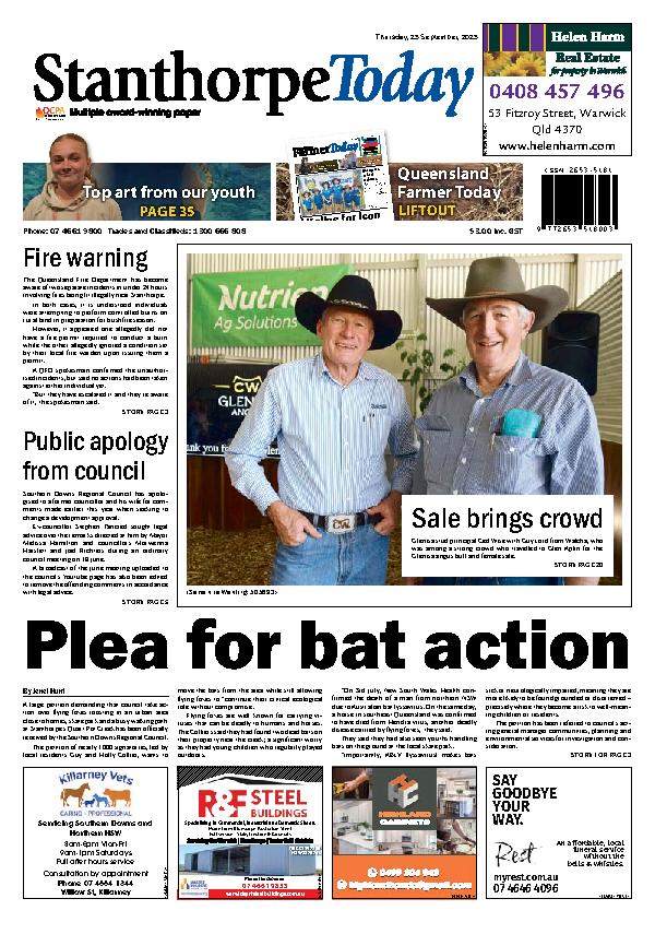 Stanthorpe Today – 25th September 2025 Subscribe or Login to see the rest of the content. Username Password * Remember Me Forgot Password News Cricket season returns 10/10/2025 Bring out the cricket bats and dust off the pads - Cricket season returns to the Southern Downs and Granite Belt this weekend... Australian sheep flock declines as producers prepare for gradual rebuild 10/10/2025 Australia’s sheep industry is navigating a challenging period, with the national flock contracting by 6.2 per cent to 74.2 million head as of June,... Setting the gold standard 10/10/2025 Warwick Rodeo and Gold Cup is set to bring world-class campdrafting and rodeo back to the region again this month. From campdraft’s uniquely Australian roots...