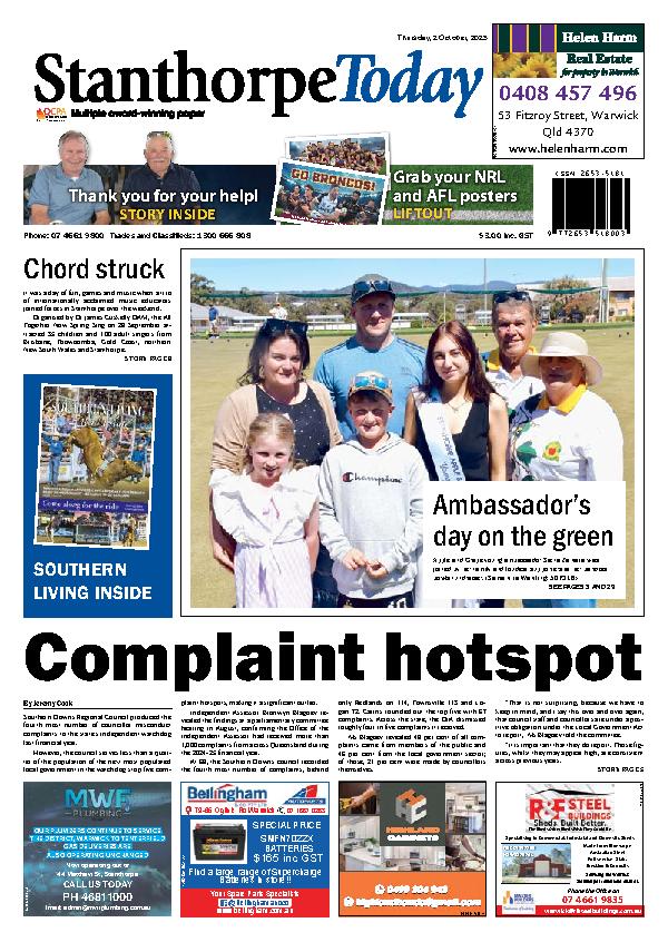 Stanthorpe Today – 2nd October 2025 Subscribe or Login to see the rest of the content. Username Password * Remember Me Forgot Password News Cricket season returns 10/10/2025 Bring out the cricket bats and dust off the pads - Cricket season returns to the Southern Downs and Granite Belt this weekend... Australian sheep flock declines as producers prepare for gradual rebuild 10/10/2025 Australia’s sheep industry is navigating a challenging period, with the national flock contracting by 6.2 per cent to 74.2 million head as of June,... Setting the gold standard 10/10/2025 Warwick Rodeo and Gold Cup is set to bring world-class campdrafting and rodeo back to the region again this month. From campdraft’s uniquely Australian roots...