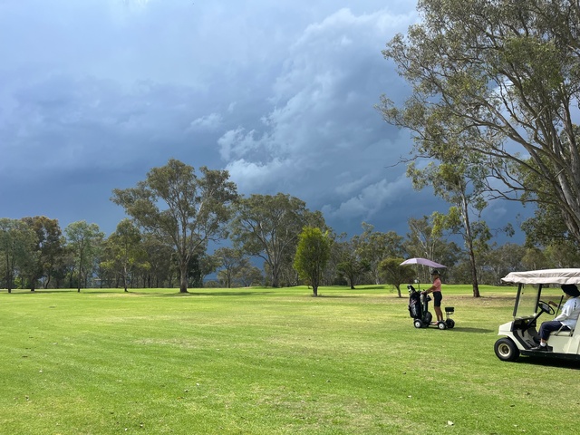 It was a big weekend for Warwick Women's golfer Jill Barnes, seen here making her way up the 18th fairway before Saturday's storm hit. Barnes beat both the storm and her competition to win Saturday's event. (Supplied).